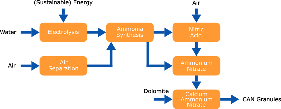 The initial option that comes to mind when considering sustainable fertilizer production is the production of hydrogen through electrolysis rather than, for instance, steam reforming of natural gas. The green hydrogen generated can subsequently be processed into fertilizers using well-established technologies that can be specifically optimized for this purpose. For instance, this approach can be utilized to produce green calcium ammonium nitrate.