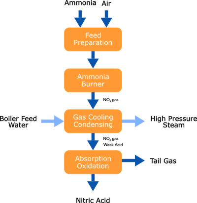 Nitric acid is produced from ammonia utilizing the Ostwald process in either dual or mono-pressure form depending on required plant size.