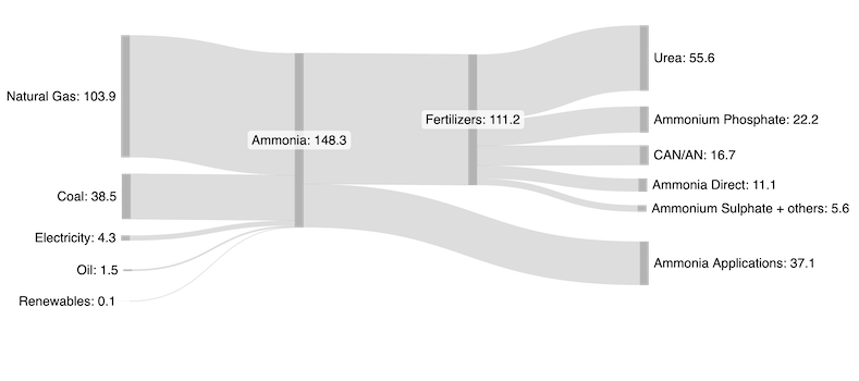 Chart of ammonia production and distribution to fertilizers in Mt-N/year based on figures from the U.S. Geological Survey, Mineral Commodity Summaries, January 2024