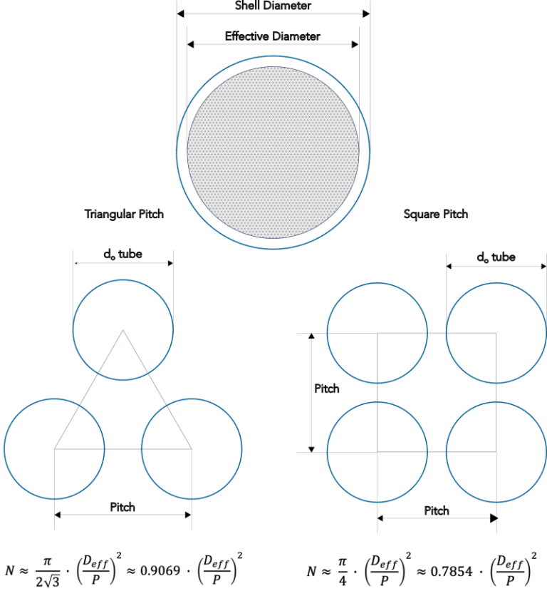 By providing the effective Tube Sheet diameter (outer tube limit), the tube layout and Pitch the number of tubes fitting in the tube sheet are estimated. For an accurate result it is always advized to draw the tube sheet in detail including the spaces required for other internals that influence the space available for tubes. The estimation as shown below is based on a mathematical approximation and will be less correct when tube sheet diameters are small.